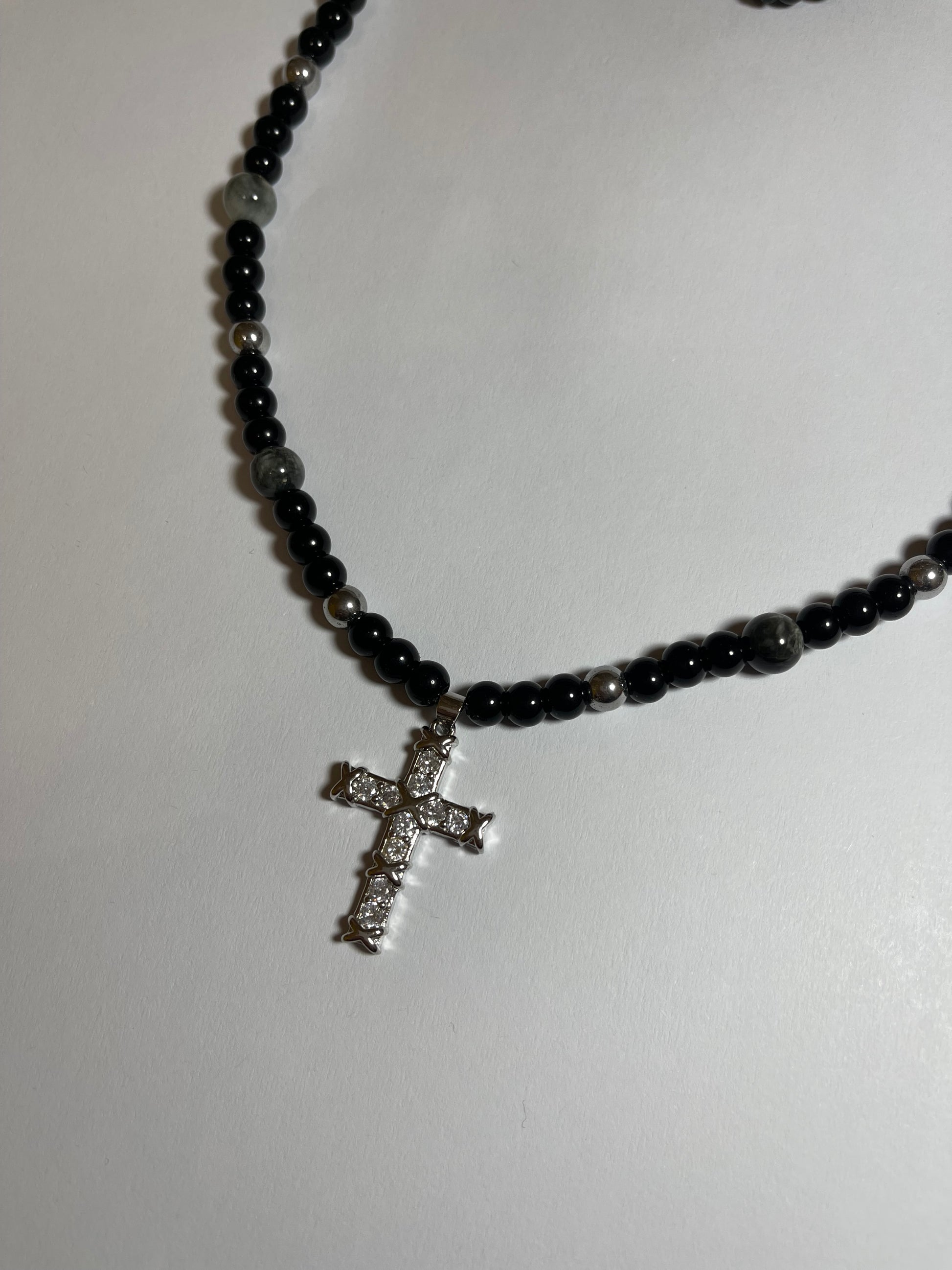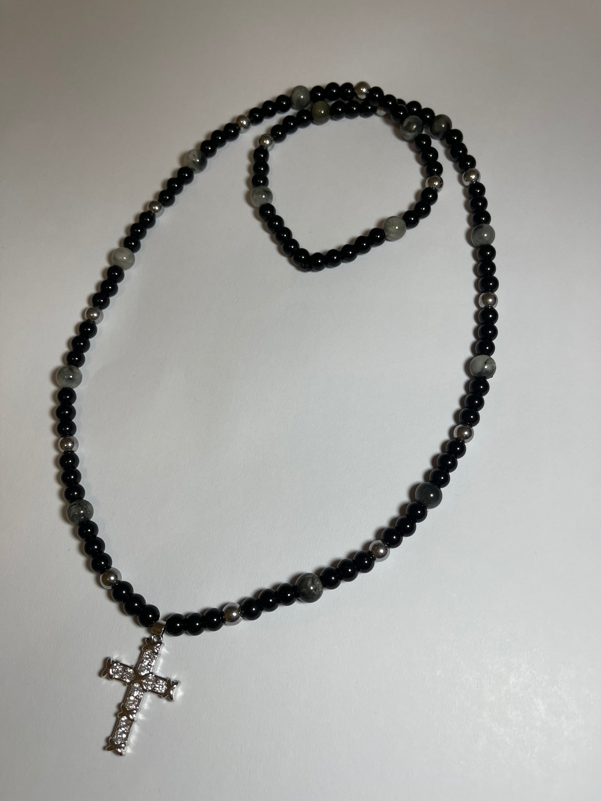 Collar de ónix, hematita plata y labradorita con dije de cruz con zirconias