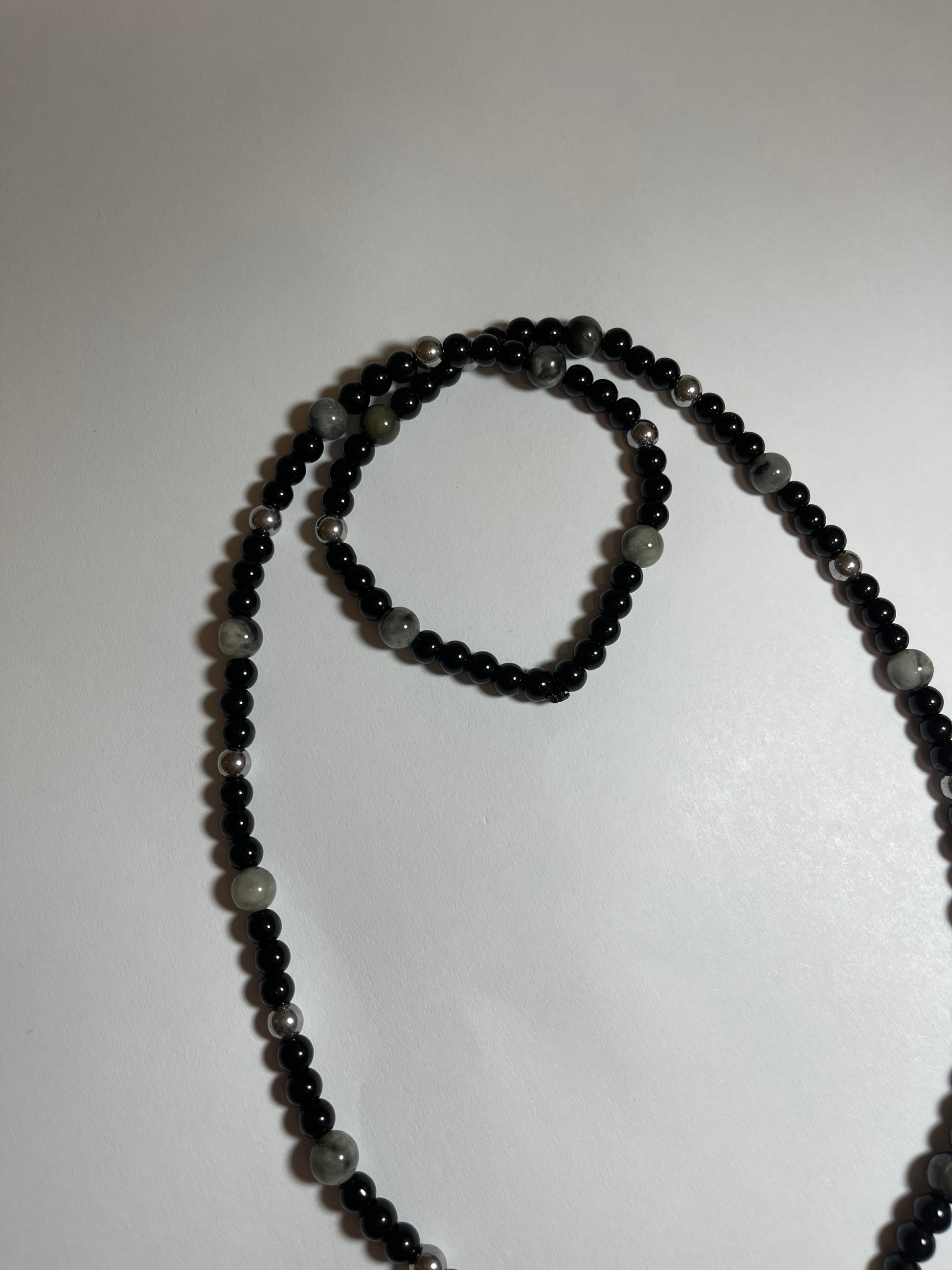 Collar con componentes de hematita en color plata y negro, ónix negro, labradorita de 8mm y dije de hematita con zirconias.