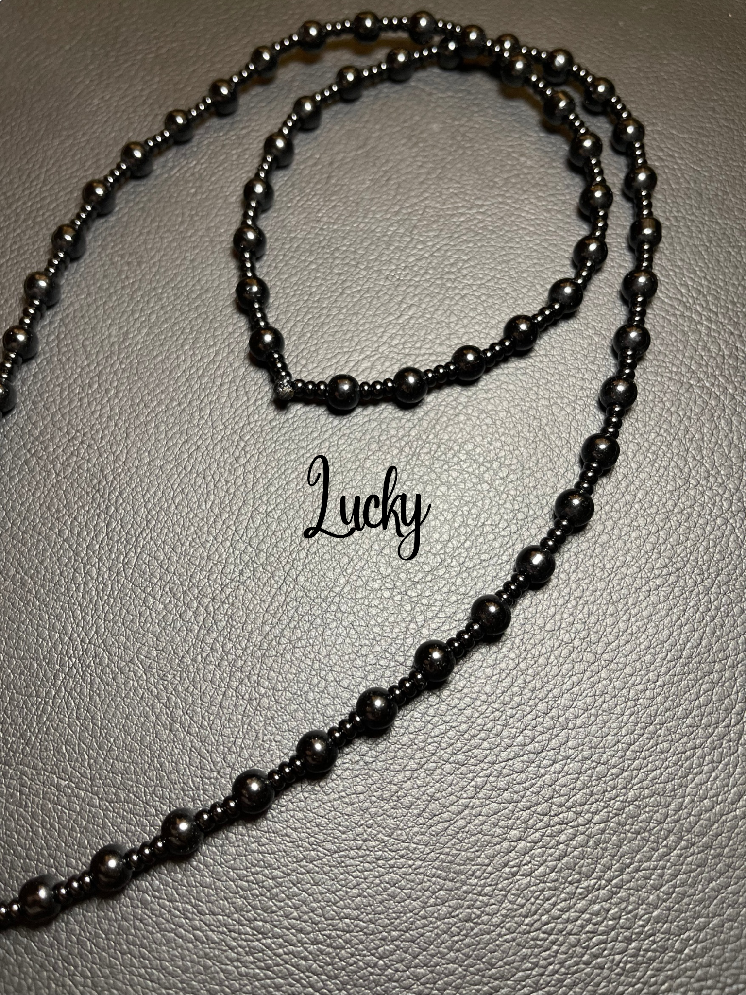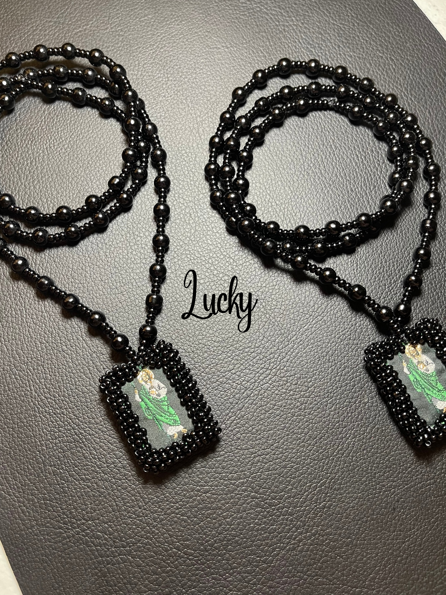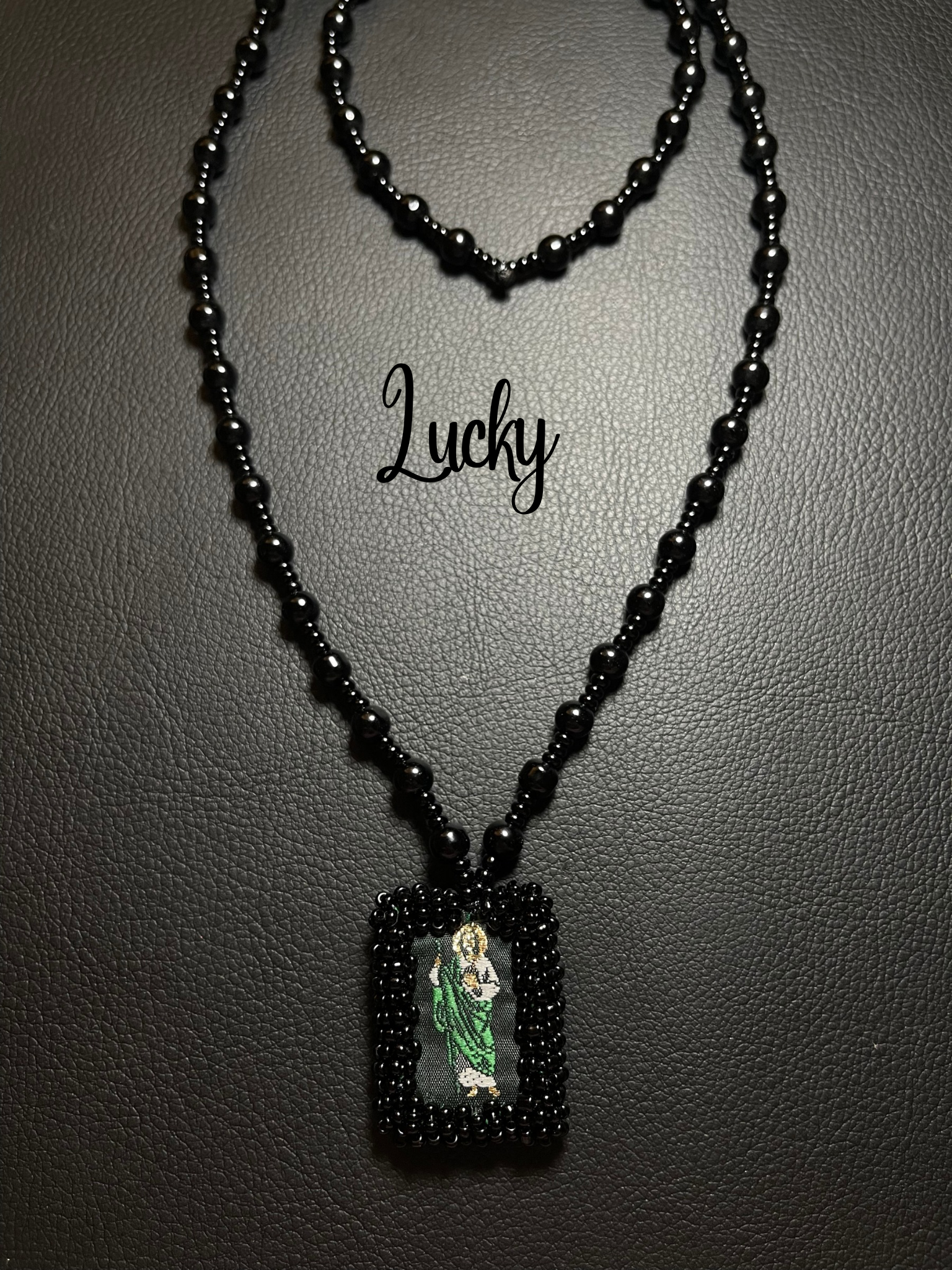 Collar escapulario San Judas Tadeo en color negro, contiene ónix negro y chaquira calibrada.