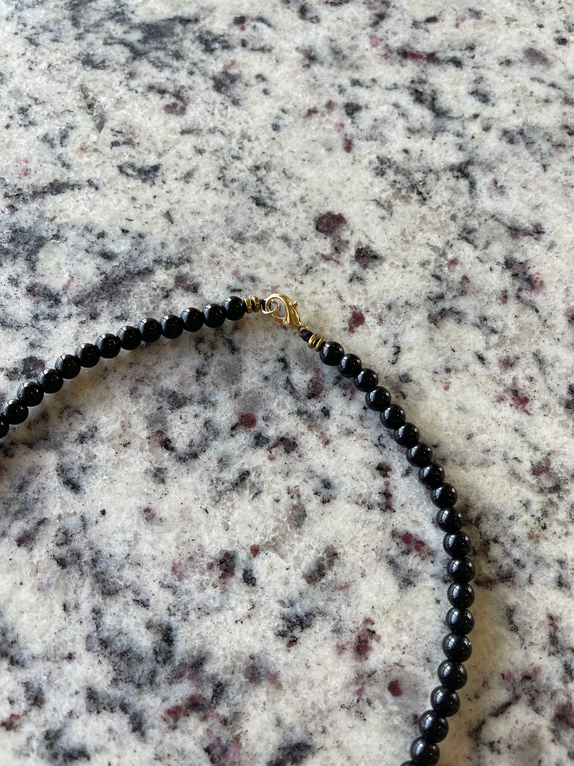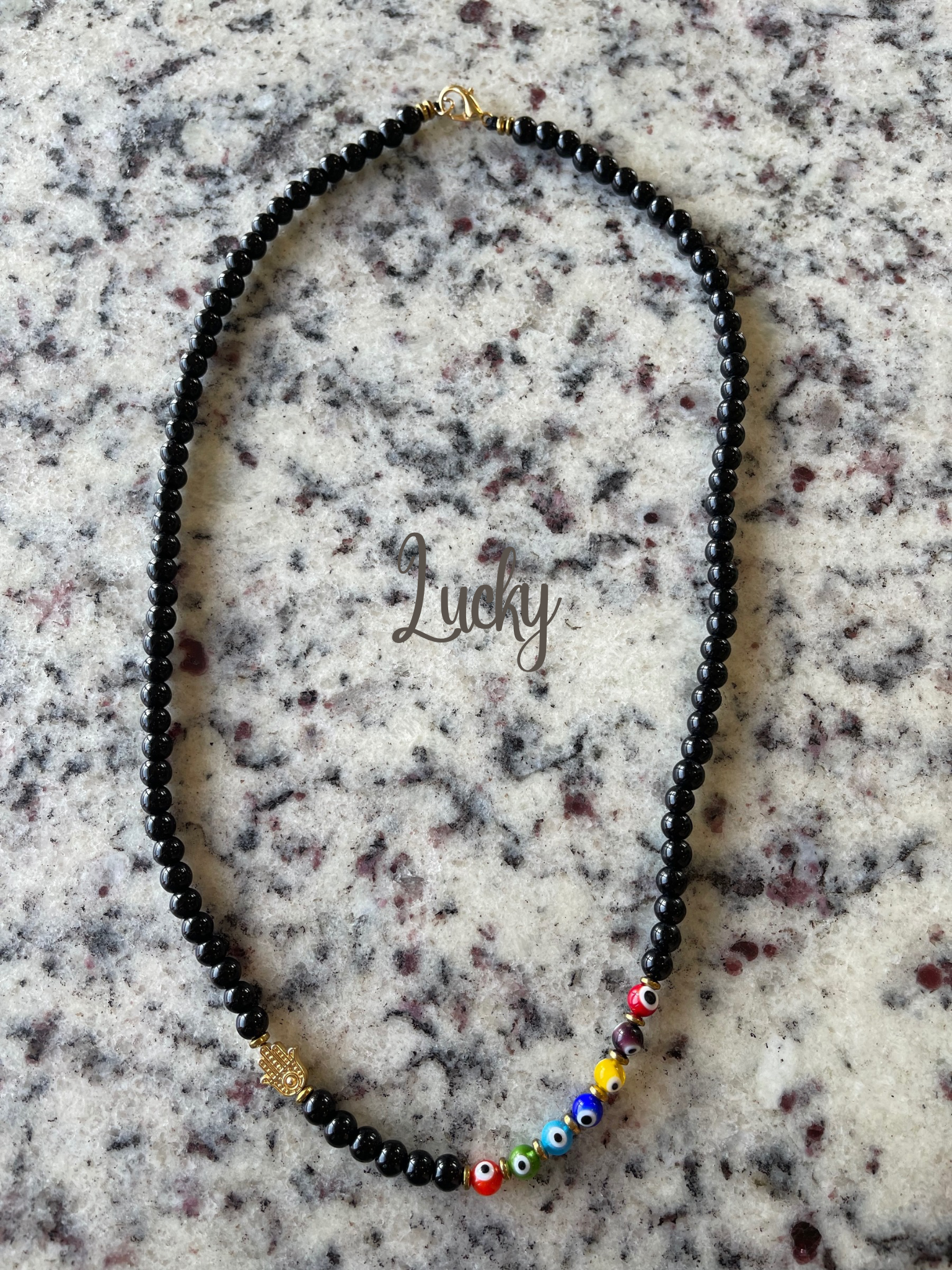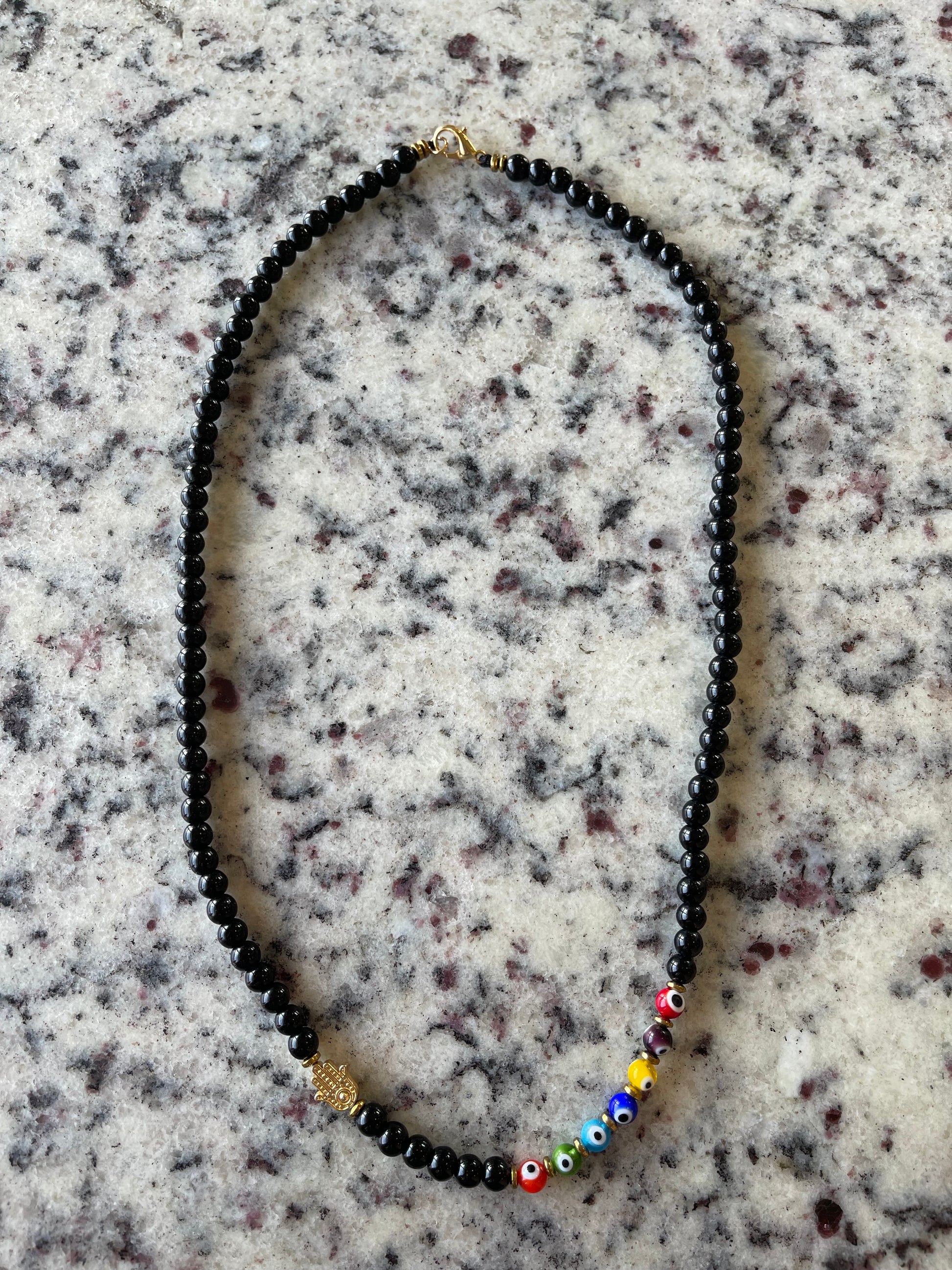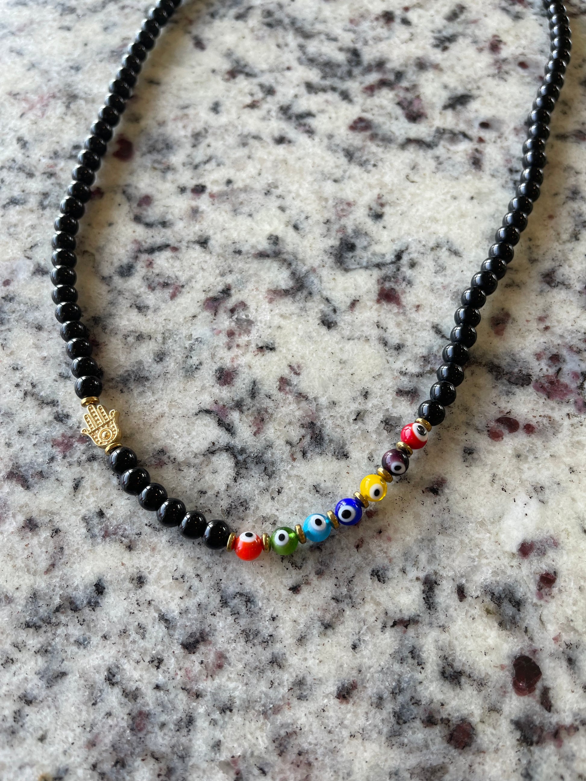 Collar de ónix negro con separadores en forma de disco de hematita dorada, dije de mano de Fátima y ojos turcos.