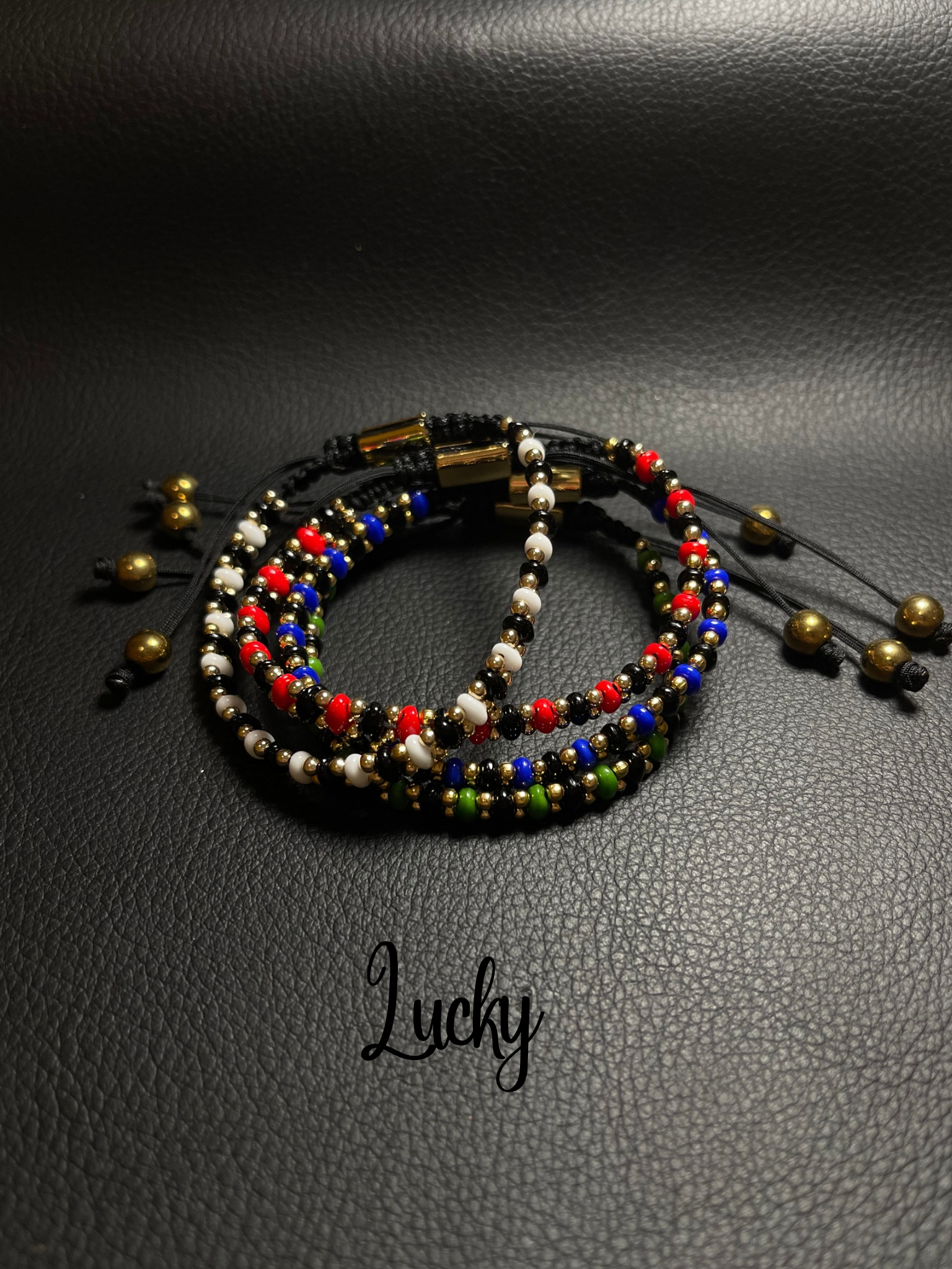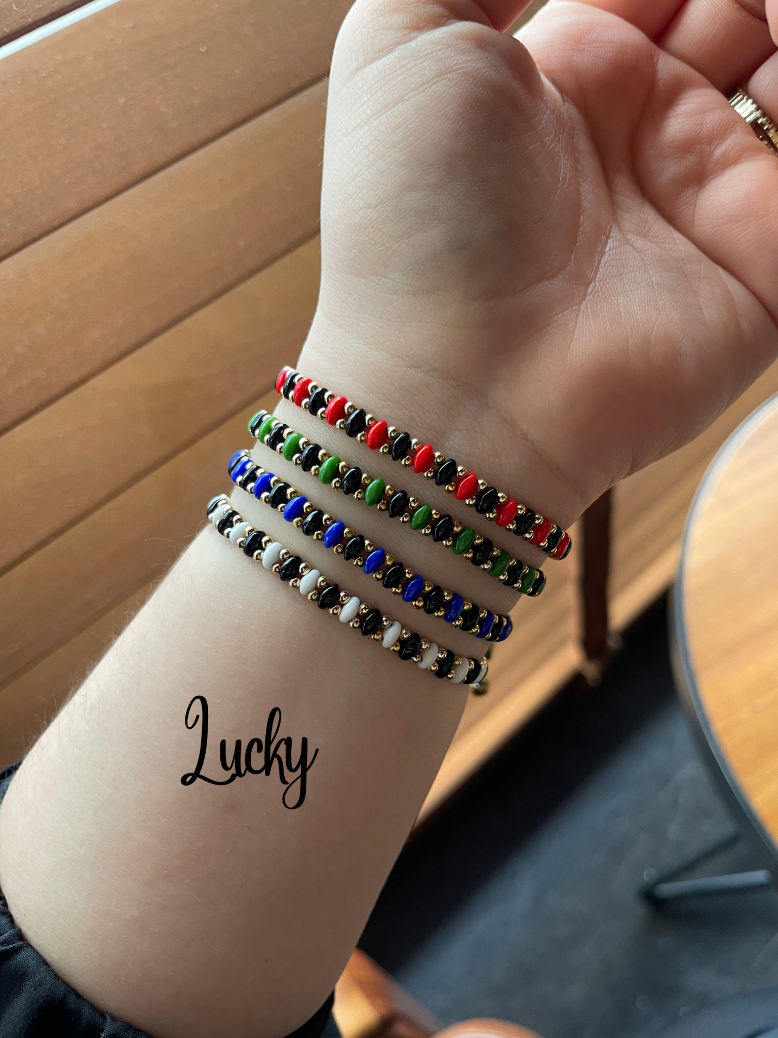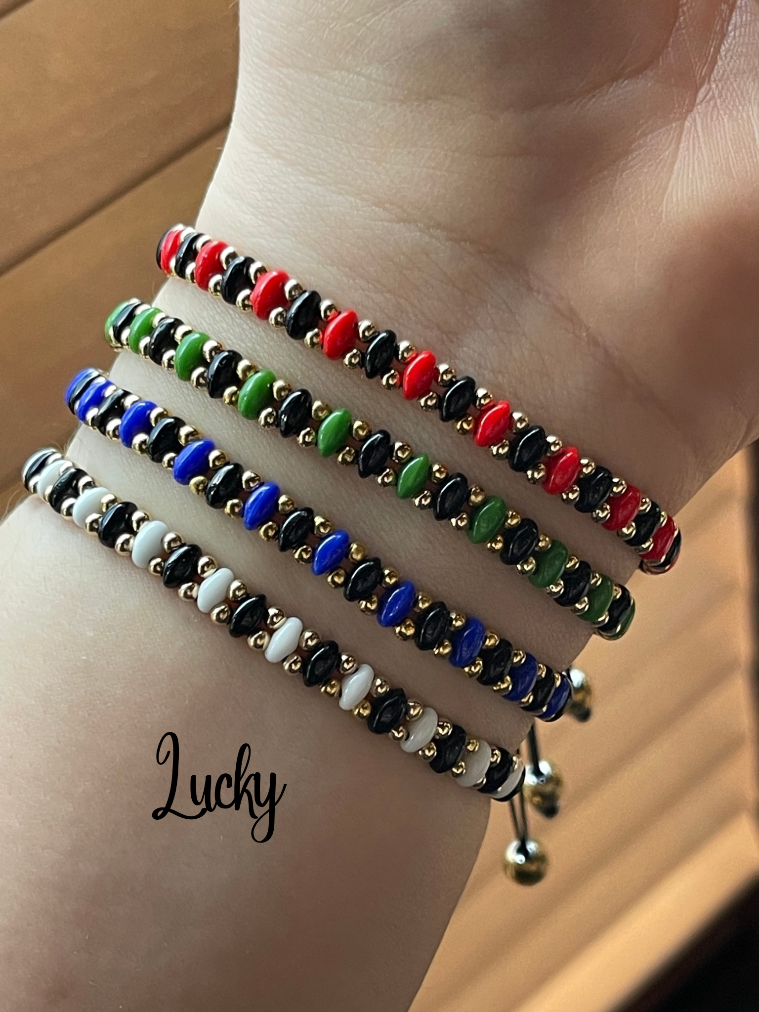 Pulsera de chaquira tipo arroz con separadores de chapa de oro 18k.