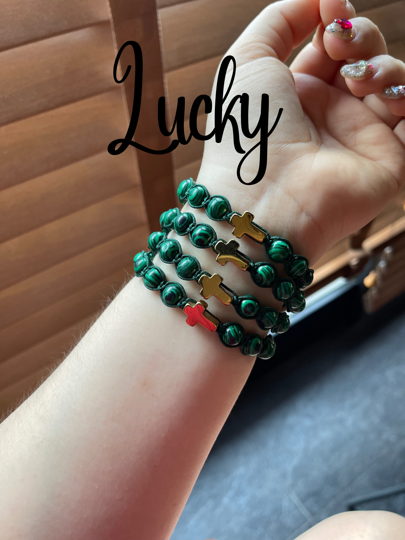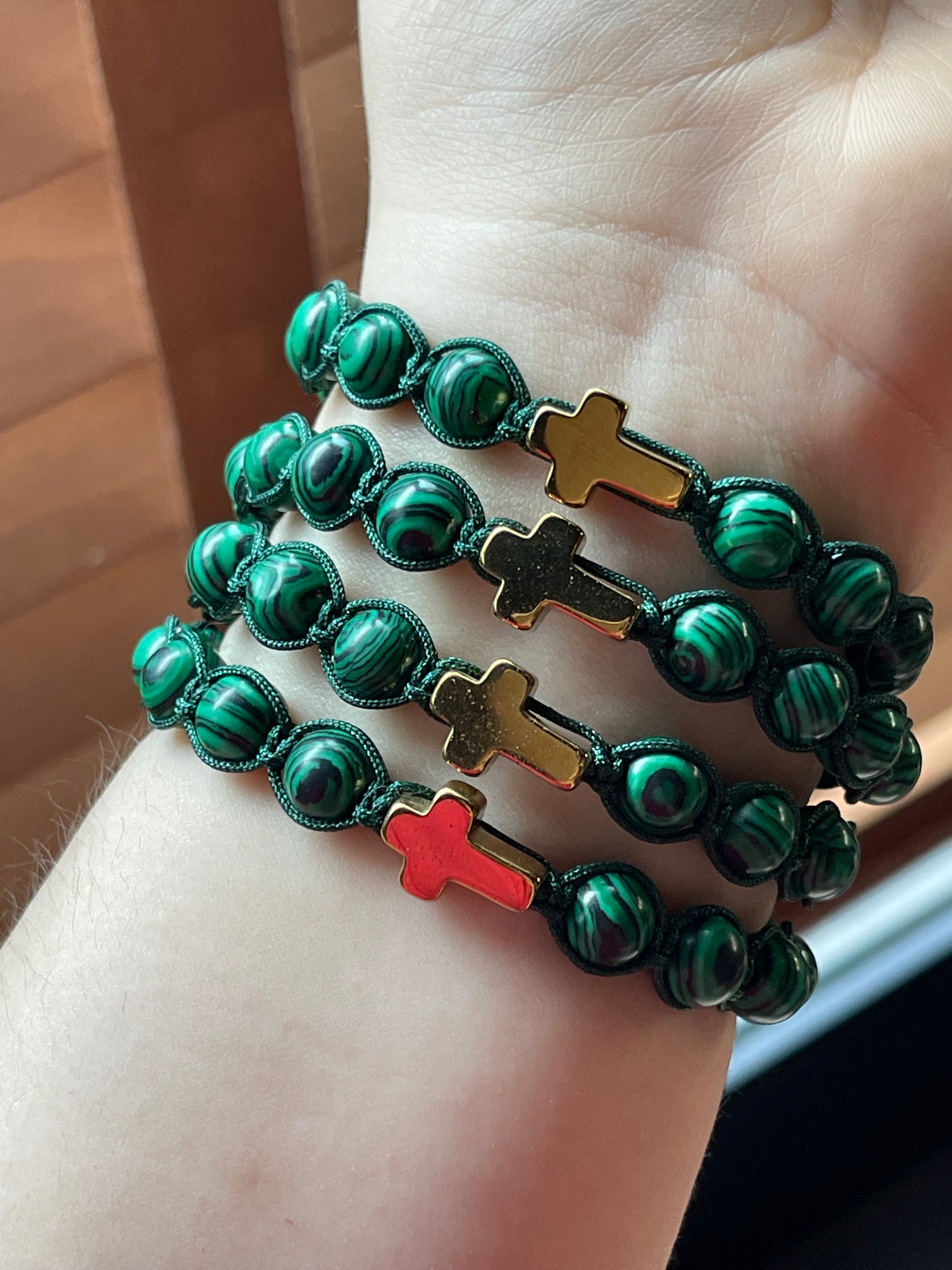 Pulseras tejidas con componentes de malaquita verde de 8mm y dijes de cruz en hematita dorada.