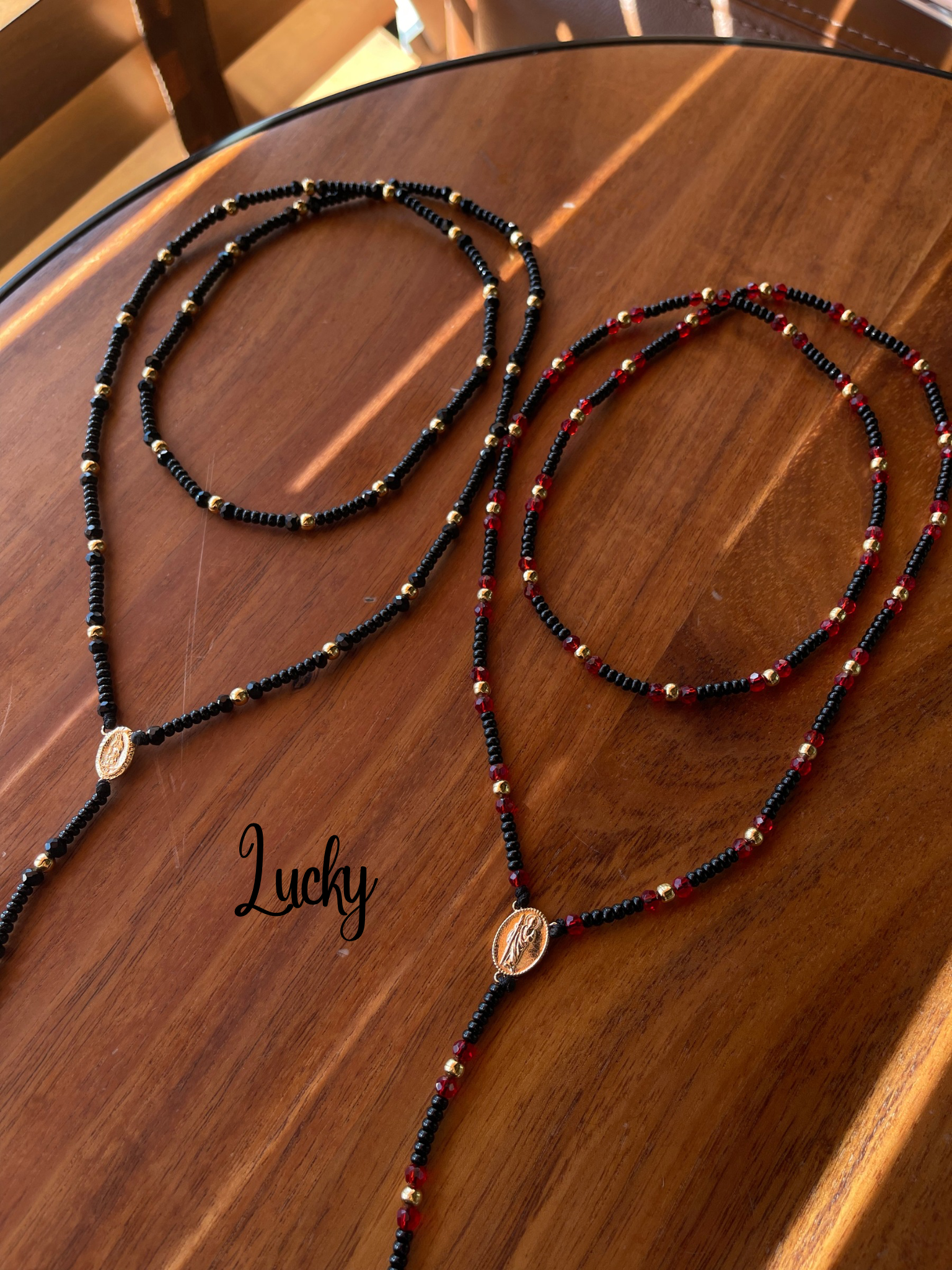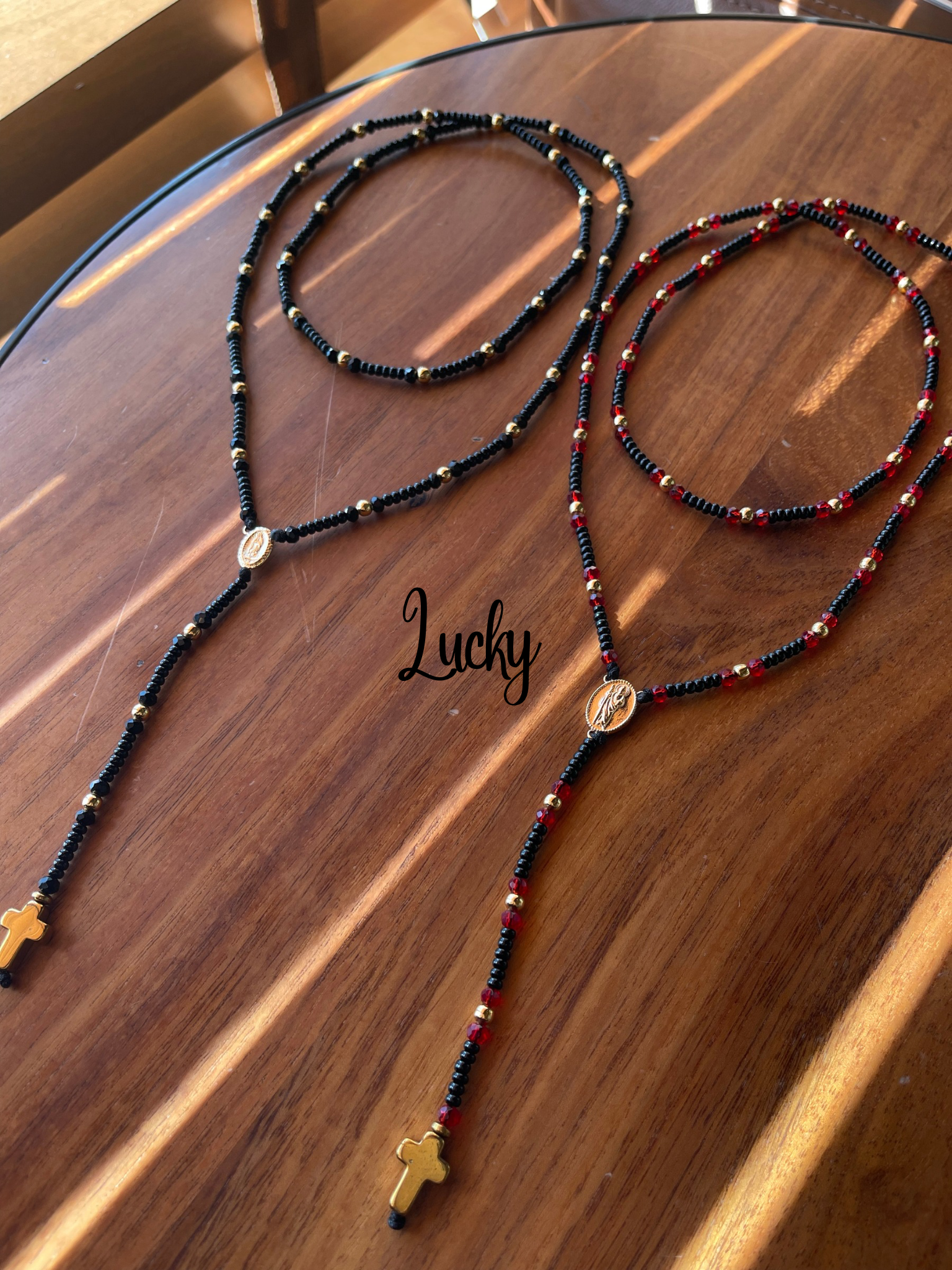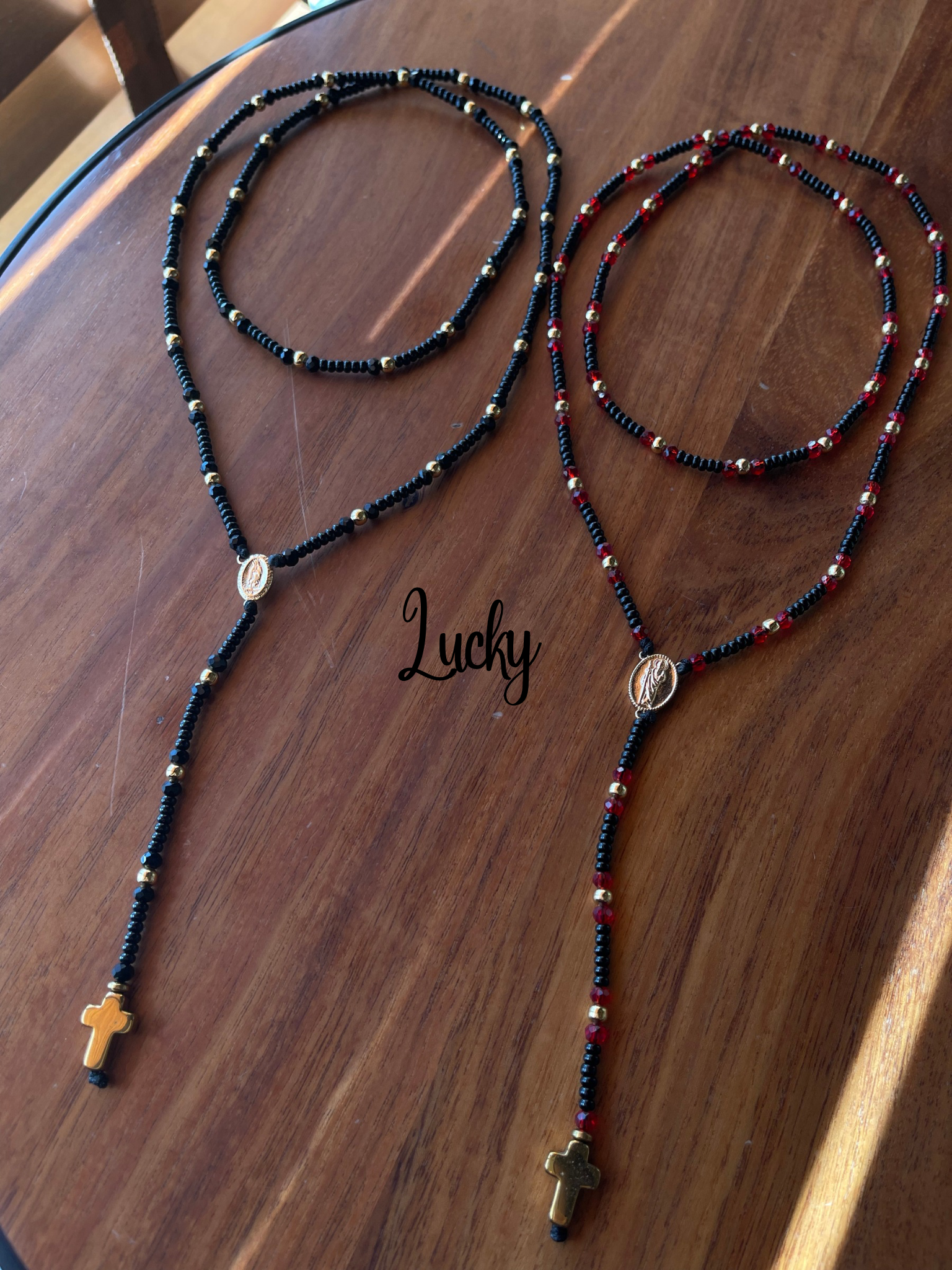 Rosario de chaquira calibrada y cristal en color negro con separadores de baño de oro de 18k.