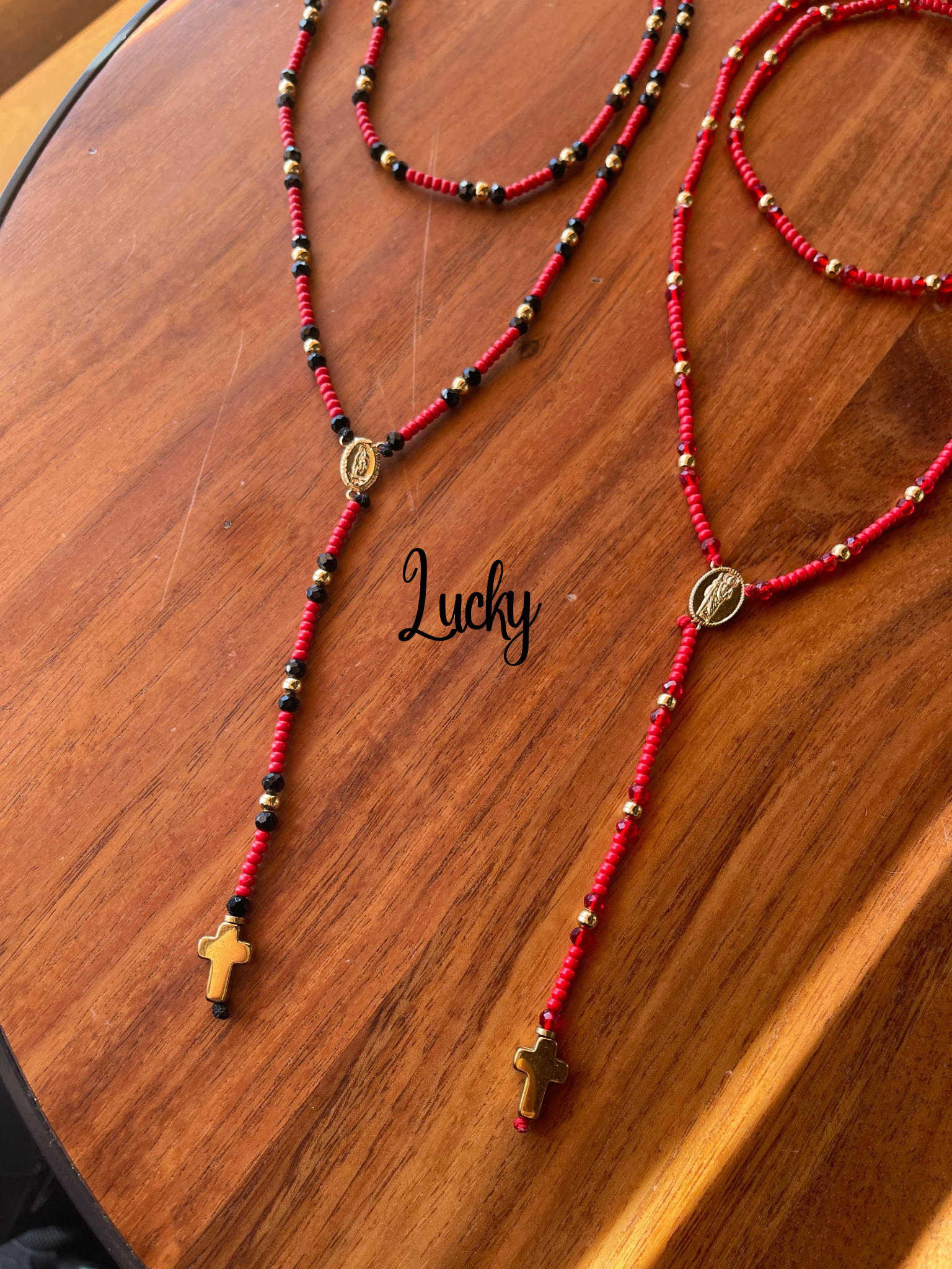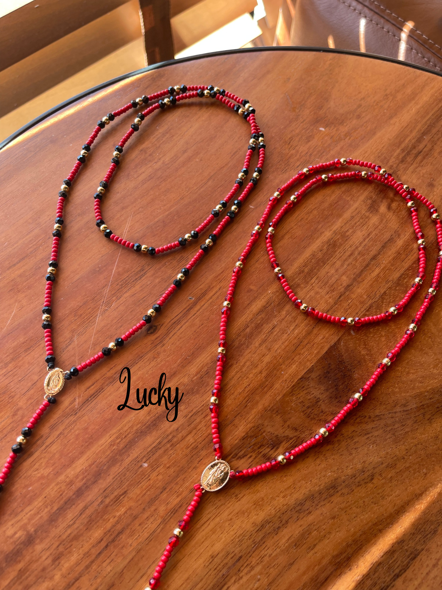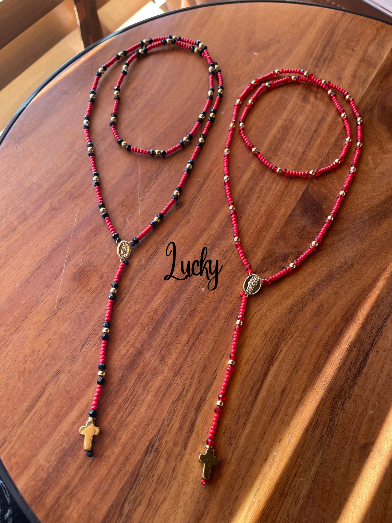Rosario en chaquira calibrada y cristal en color rojo con separador de baño de oro 18k