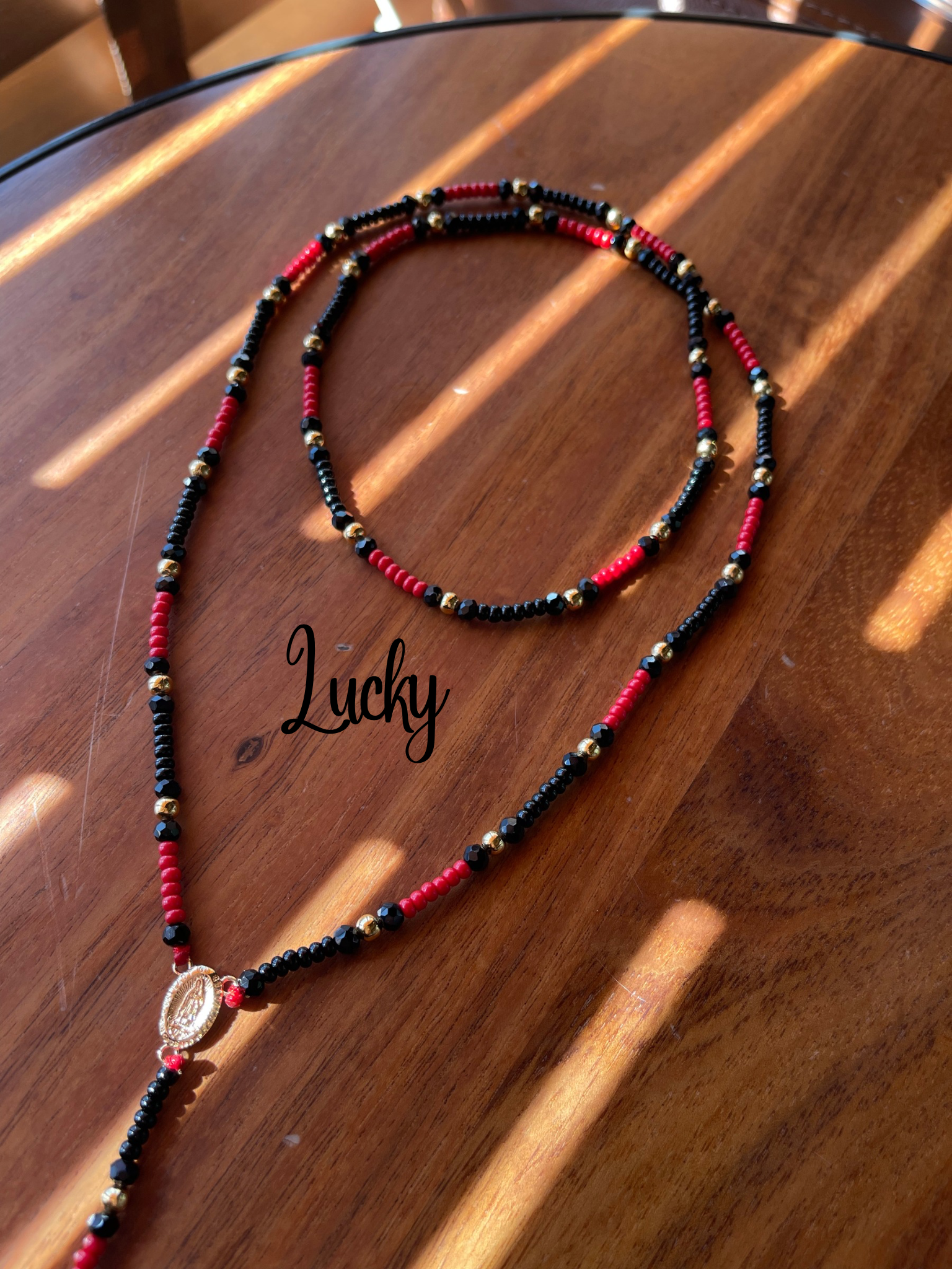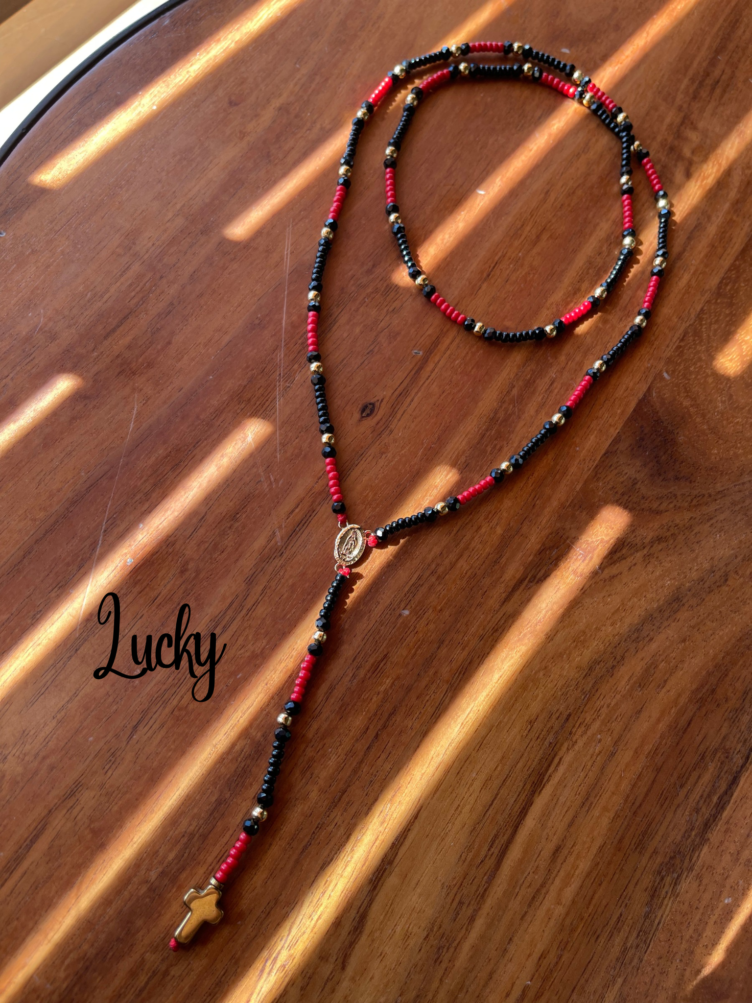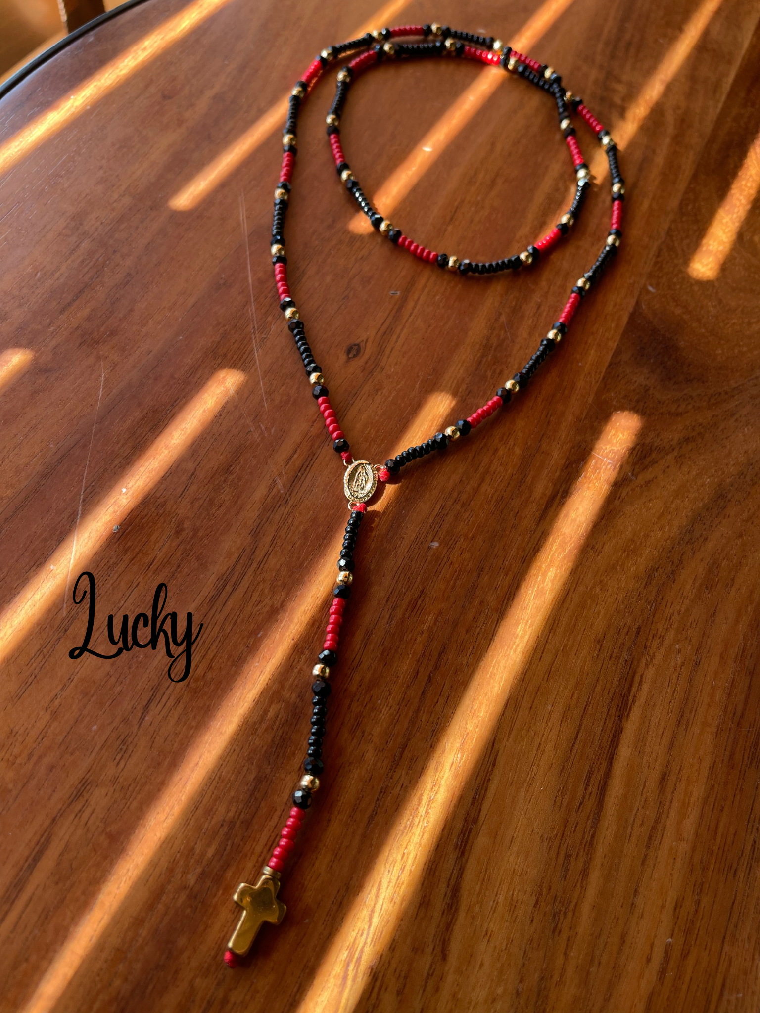 Rosario en chaquira calibrada + cristal en color negro y rojo