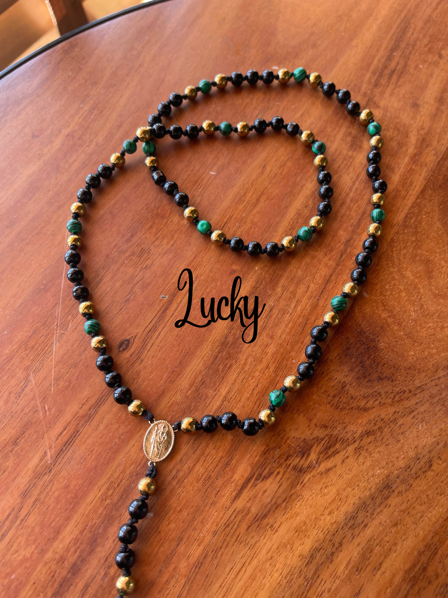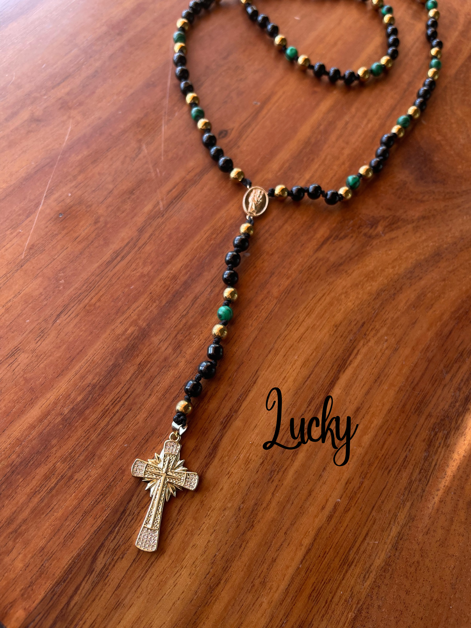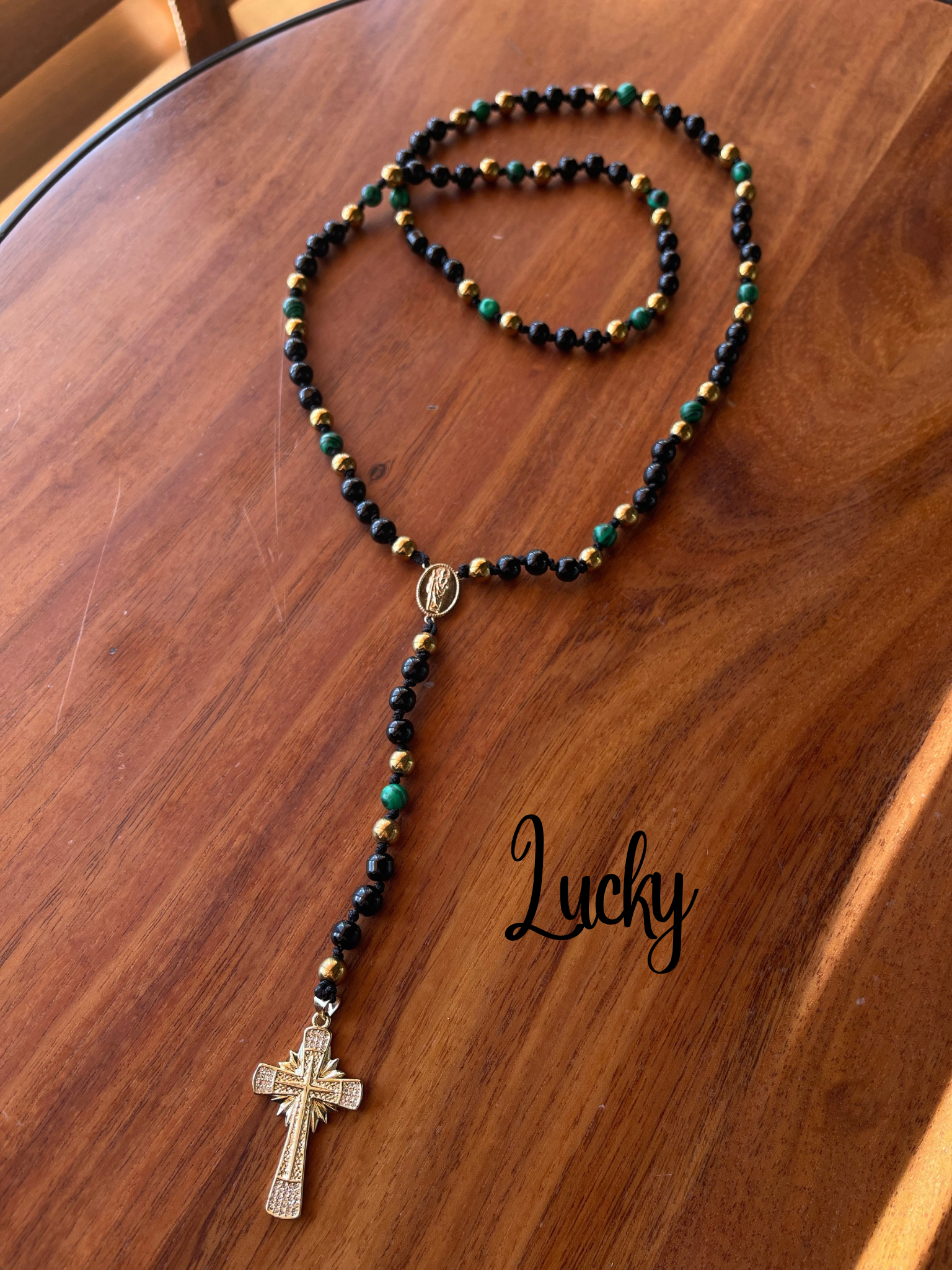 Rosario de ónix negro con toque de malaquita verde y hematita