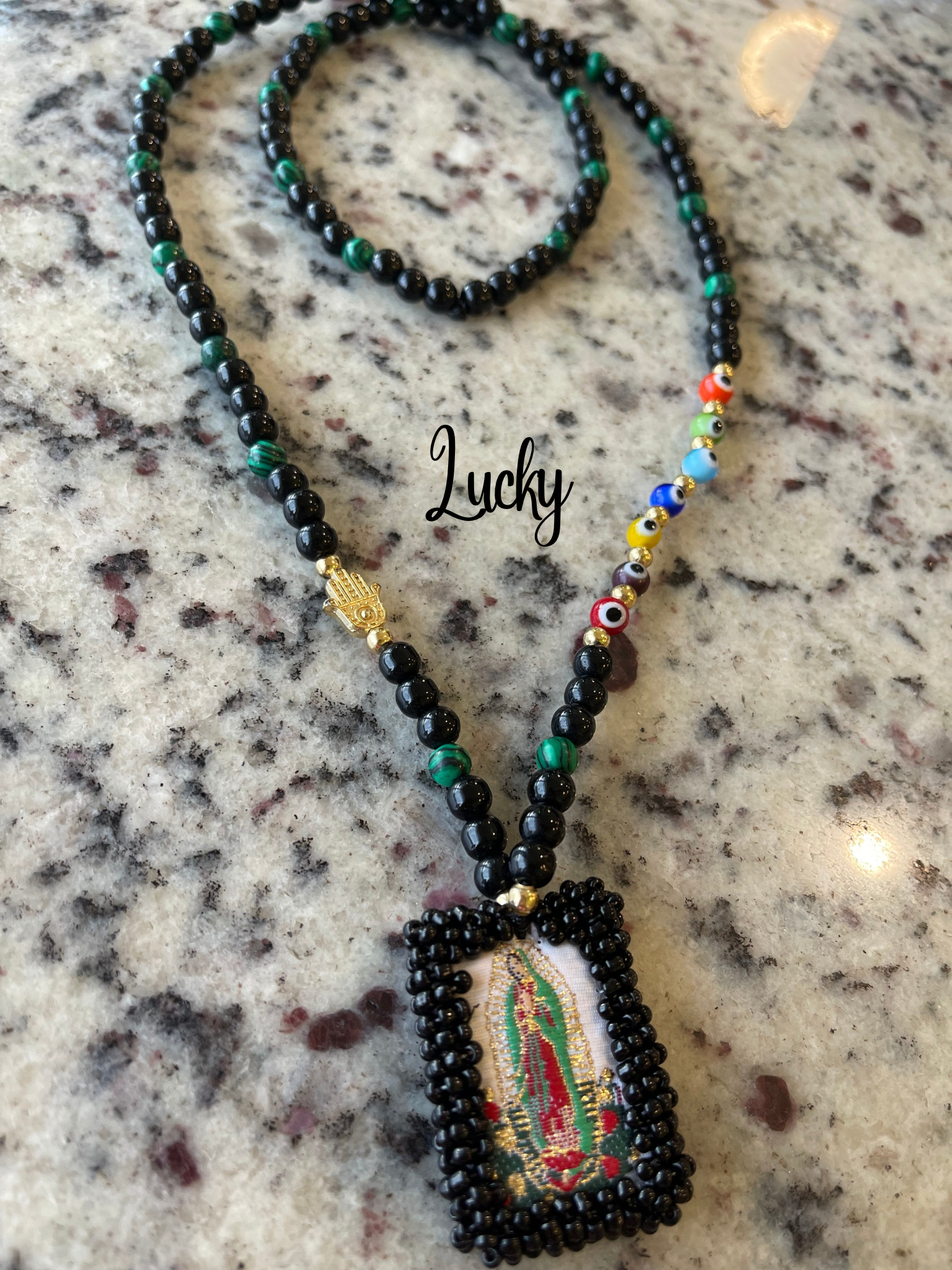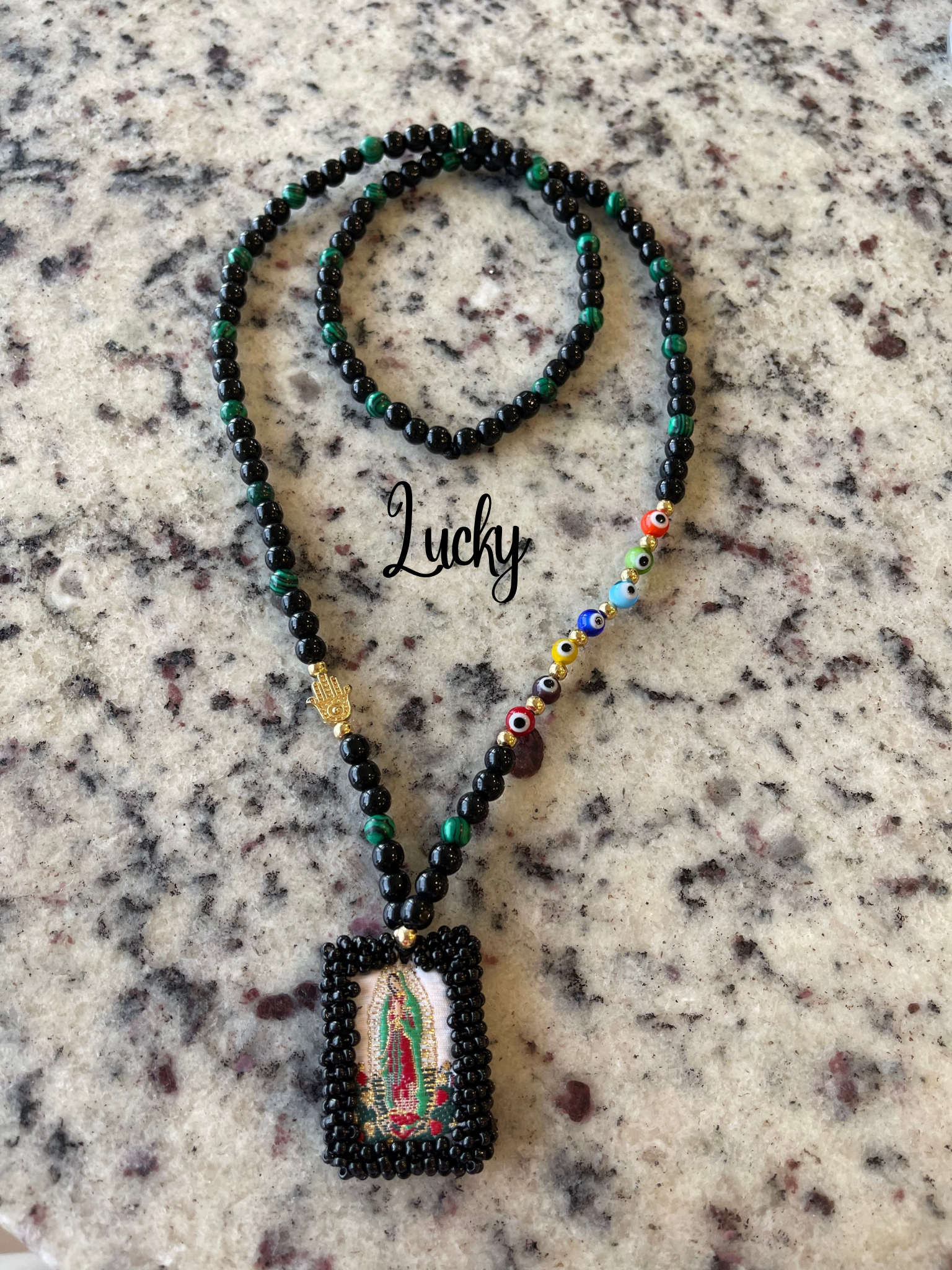 Collar escapulario de virgen de Guadalupe en ónix y malaquita verde con ojitos turcos de colores.